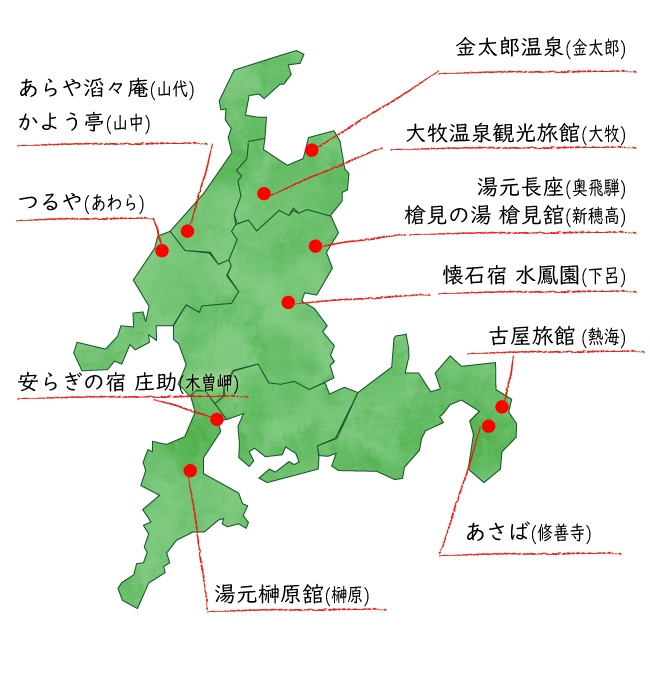 東海・北陸 2020.09.15 2020.09.01 静岡県 熱海温泉 古屋旅館 413-0012 静岡県熱海市東海岸町5-24 0557-81-00010557-83-6635(FAX) 修善寺温泉 あさば 410-2416 静岡県伊豆市修善寺3450-1 0558-72-70000558-72-7077(FAX) 岐阜県 奥飛騨温泉郷 キャンペーン参加中☆ 湯元長座 506-1434 岐阜県高山市奥飛騨温泉郷福地温泉 0578-89-0099 新穂高温泉 槍見の湯 槍見舘 506-1421 岐阜県高山市奥飛騨温泉郷神坂 0578-89-28080578-89-2309(FAX) 下呂温泉 懐石宿 水鳳園 509-2202 岐阜県下呂市森2519-1 0576-25-22880576-25-5338(FAX) 三重県 木曾岬温泉 安らぎの宿 庄助 498-0816 三重県桑名郡木曽岬町源緑輪中794 0567-68-18010567-68-1802(FAX) 榊原温泉 湯元 榊原舘 514-1251 三重県津市榊原町5970 059-252-0206 富山県 金太郎温泉 金太郎温泉 937-0013 富山県魚津市天神野新6000 0765-24-12200765-24-6021(FAX) 大牧温泉 大牧温泉観光旅館 932-0371 富山県南砺市利賀村大牧44 0763-82-03630763-82-0933(FAX) 石川県 山代温泉 キャンペーン参加中☆ あらや滔々庵 922-0242 石川県加賀市山代温泉湯の曲輪 0761-77-00100761-77-0008(FAX) 山中温泉 かよう亭 922-0114 石川県加賀市山中温泉東町1丁目ホ20 0761-78-14100761-78-1121(FAX) 福井県 あわら温泉 つるや 910-4104 福井県あわら市温泉4丁目601 0776-77-20010776-78-7002(FAX)